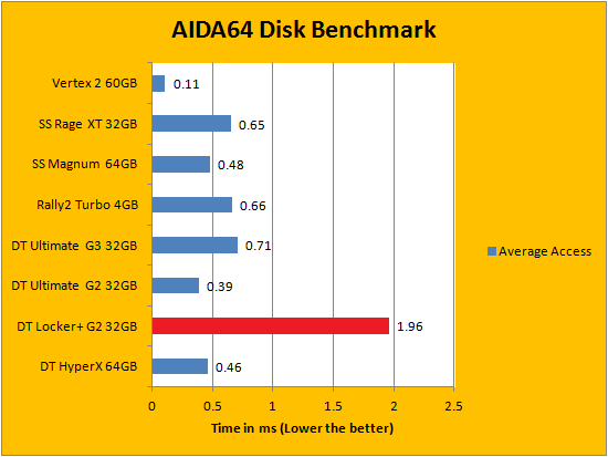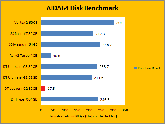 I'd just like to make it clear from the start that we are, by no means, expecting Kingston DataTraveler Locker+ G2 32GB to deliver performance competitive with the OCZ Vertex 2 60GB SSD, even though it is a rather old SSD. Heck, we don't even expect the Locker+ to be anywhere near the batch USB 3.0 performance drives we used for reference -- this is a self-encrypting USB 2.0 device that is, by no means, designed for class leading performance. I mean, if you are expecting an armored vehicle to be faster than a Lamborghini, you are just buying the wrong car (Until you get shot, anyway). That said, we are not saying performance is not important, it is just more of a secondary priority. Our AIDA64 results provide interesting insight to the performance of the Kingston DataTraveler Locker+ G2. Delivering up to 17.8MB/s sequential read, 17.5MB/s random read, and 18.2MB/s buffered read, it is certainly slower than even the OCZ Rally2 Turbo 4GB from the days of the dinosaurs, but being a self encrypting drive and all, I was actually surprised the Locker+ actually still provided reasonably good speed. Its 1.96 ms random access time is relatively high by USB 2.0 drive standards, but then again, considering it being a self encrypting drive, it is hard to make a case against the security oriented Locker+ in my personal opinion.