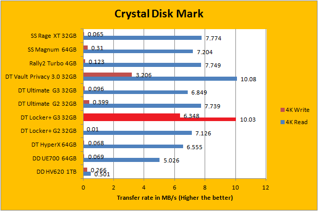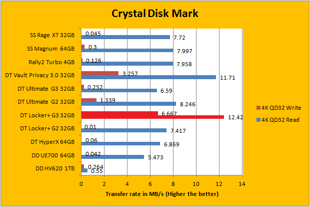 The Kingston DataTraveler Locker+ G3 32GB continues to perform well as we move into our Crystal Disk Mark sequential read and write results. Its read results are competitive, but its write performance is certainly the highlight of the day -- considering this is an encrypted write test. But if there is anything we need to talk about today, it will have to be the stuff on the next three graphs. Let me put it this way: Its write performance is simply outstanding. In the 512K write test, it was twice as fast as the DataTraveler Vault Privacy 3.0 32GB -- and that drive was a winner by several miles already. With a 512K write figure of 76.23MB/s, this is a ridiculously good figure in the midst of drives that normally gets around 1 MB/s. In fact, it was so good, I had to rerun the test several times to ensure I am not hallucinating. As we move into the 4K and 4K QD32 territory, which requires high input/out operations per second (Commonly referred to as IOPS), the Kingston DataTraveler Locker+ G3 32GB continues to dominate the competition like a tank on an ant. Seriously, look at the graphs. As far as its read performance is concerned, the company's latest encrypted drive is either the fastest or second fastest in the last two tests. My friends, this is not a typo. If you have tens of thousands of Microsoft Word files to load into your USB flash drive, your time has come.