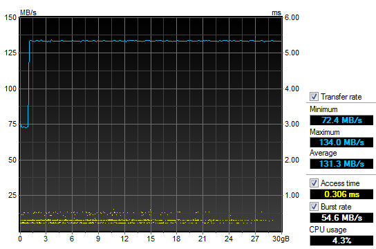 Unfortunately, HD Tune does not generate any fancy independent graph outputs in particular, so I had to edit my screenshot out a bit to make it look better for publishing in a review. Again, like our HD Tach results on the previous page, the line is virtually flat as before, just like how it is supposed to be. It differs slightly in magnitude than the other program -- probably due to testing algorithms used -- but its performance characteristics are identical in practice. Other than that, one interesting thing to note is, from the three programs I have used that keeps track of the access time of a drive, the Kingston DataTraveler Locker+ G3 32GB in HD Tach and HD Tune both came out to be around 0.3ms, depending on the level of precision in presents. AIDA64 is slightly lower at 0.28ms, which is still pretty close. Everything else should be self-explanatory.