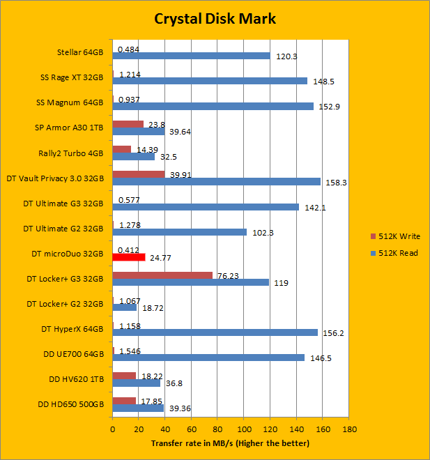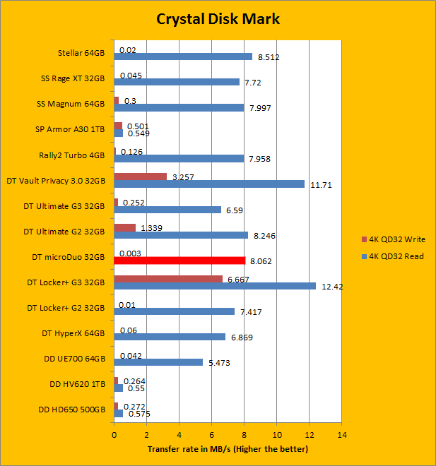 Moving to the Crystal Disk Mark 3.0, we can really see the advancement of USB 3.0 in comparison to its older counterpart. Unfortunately, the Kingston DataTraveler microDuo 32GB is a victim of these advances, as we can see from these graphs. Much like ATTO Disk Benchmark, the Kingston DataTraveler microDuo is also faster than the Kingston DataTraveler Locker+ G2, but behind the OCZ Rally2 Turbo. On to the 512K write and read, the microDuo is actually pulling a respectable 24.77MB/s read, but falters at 0.412MB/s write. The 4K and 4KQD32 tests are next, and are designed to test for input/output operations per second (Commonly referred to as IOPS). Our review item in question is actually surprisingly fast at 4K read, even faster than some USB 3.0 thumb drives, but the write speed is so slow, we cannot even see a bar on the graph. The same is true for the 4K QD32 tests, as the read speed from the Kingston DataTraveler microDuo 32GB is actually a respectable 8.062MB/s, and keeps up quite a few USB 3.0 devices. Traditionally, USB sticks are weak in this area, and while some more recent flash drives are finally stepping up to the task of conquering higher IOPS, the microDuo is not one of the conquerors. We can only hope more manufacturers will continue to strive for better speeds, but all we can do is wait for now. Of course, bringing it back to the review at hand, the Kingston DataTraveler microDuo 32GB is not meant to be a speed demon, so it is only reasonable to wait for a different device to be faster.