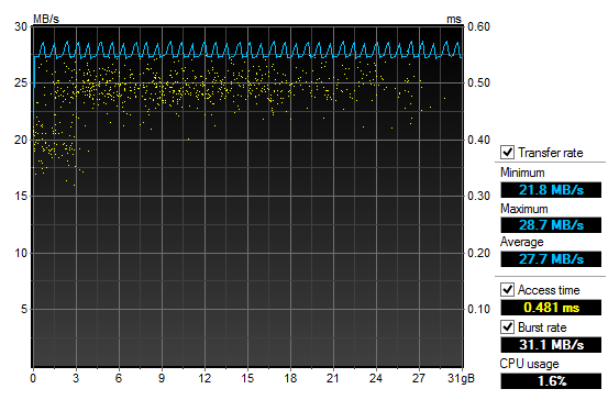 Our final benchmark is HD Tune Pro 4.60, which unfortunately does not provide very nice or fancy independent graph outputs in particular, so I had to edit my screenshot to make it a bit more publishable for a review. Again, like our HD Tach results, the line trends to be flat. While the magnitude itself may differ, this is only due to the different algorithms used in testing, but the overall characteristics are consistent in practice. Our final thing to note are the access times of the drive. From the HD Tach, as reported on the last page, the time was around 0.4ms, and from HD Tune Pro, we get a time around 0.481ms. While not exactly the same, it is somewhat close. Otherwise the results are pretty self-explanatory.