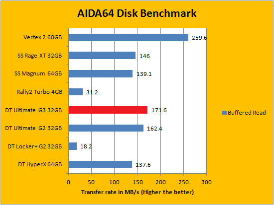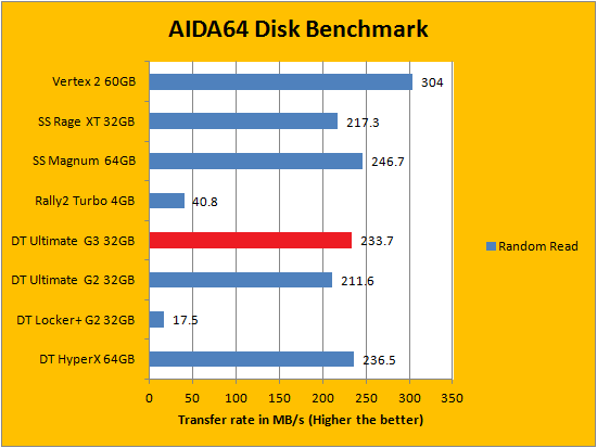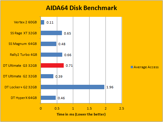 I'd just like to make it clear from the start that we are, by no means, expecting Kingston DataTraveler Ultimate 3.0 G3 32GB to deliver performance competitive with the OCZ Vertex 2 60GB SSD, even though it is a rather old SSD. The Vertex 2 is a Serial ATA 3Gb/s storage device optimized for maximum I/O performance as a boot drive, whereas the DataTraveler Ultimate 3.0 G3, while advertised as a fast USB 3.0 drive, is still oriented more for mainstream performance. However, our AIDA64 results do provide interesting insight to the performance of the Kingston DataTraveler Ultimate 3.0 G3. Delivering up to 179MB/s sequential read, 233.7MB/s random read, and 171.6MB/s buffered read, it is certainly slower than the more enthusiast performance oriented HyperX and Magnum drives, but still fast by its own merits. The DT Ultimate G3 is actually pretty close to the Kingston DataTraveler Ultimate G2. Its 0.71 ms random access time is also relatively high by USB 3.0 drive standards; this is one area where the company could pay a little more attention to. It should not affect performance all that much, if at all, in real life, however.