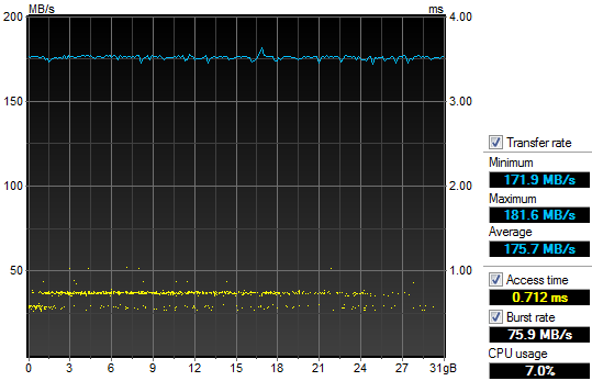 Unfortunately, HD Tune does not generate any fancy independent graph outputs in particular, so I had to edit my screenshot out a bit to make it look better for publishing in a review. Again, like our HD Tach results on the previous page, the line is nice and flat as before. It differs slightly in magnitude than the other program -- probably due to testing algorithms used -- but its performance characteristics are identical in practice. Other than that, one interesting thing to note is, from the three programs I have used that keeps track of the access time of a drive, they all came out to be around 0.7ms, depending on the level of precision in presents. Everything else should be self-explanatory.