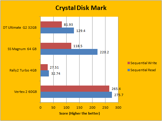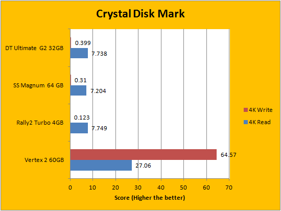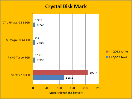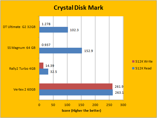 A similar pattern can be seen for the Kingston DataTraveler Ultimate G2 32GB in our Crystal Disk Mark results. When it boils down to 512K write, and any of the results after that point, it seems that the Ultimate G2 has the upper hand over the supposedly quicker Supersonic Magnum. Surprisingly, the OCZ Rally2 Turbo was very competitive in the 4K and 4K QD32 read/write benchmarks. One thing to note here is that during the 512K write, the Ultimate G2 seems to have fallen behind a bit compared to the Rally2 Turbo, and I had the expectation of USB 3.0 devices performing better than previous generations. This was also evident in the Supersonic Magnum. I would assume that in future enhancements to USB 3.0 flash drives, the performance for small file I/O performance should improve.
