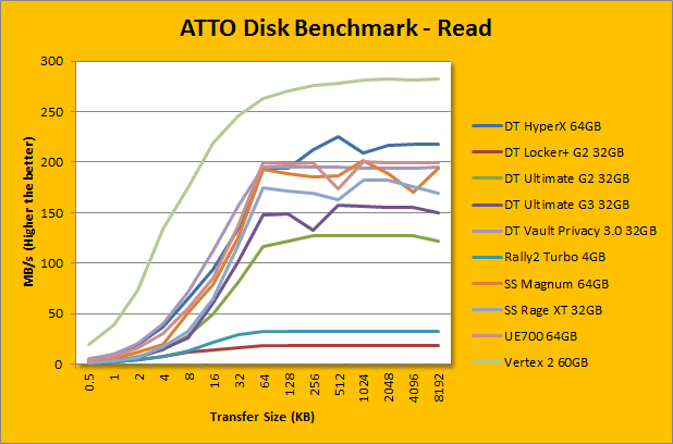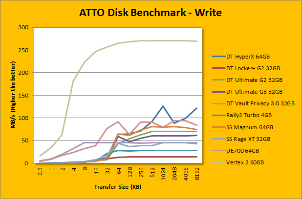 After our AIDA64 tests, our next benchmark up is ATTO. Ever since we have started using it in our network attached storage reviews a few years ago, it has been integral to our battery of storage performance evaluations here at APH Networks -- mainly due to its accuracy and thorough testing in accordance to varying transfer sizes. As you can see on our graphs above, the Kingston DataTraveler Vault Privacy 3.0 32GB's read performance greatly exceeds its write performance; peaking at 194.989 MB/s and 45.652 MB/s, respectively. These results are similar with our AIDA64 results on the previous page. Once again, you know while this flash drive is not meant for speed (Or as Jeremy Clarkson says, “SPEEEEEED!”), it can take on challengers and hold its own ground well. Oddly enough, the DataTraveler Vault Privacy 3.0 is also quite a bit faster than the competition for smaller transfer sizes. In fact, from 0.5 to 16KB files, the recorded write speeds are faster than every USB flash drive we have tested in the past, and its read speeds outperform the Kingston DataTraveler HyperX 3.0 64GB and the ADATA DashDrive Elite UE700 64GB. At larger file sizes, the Kingston DataTraveler Vault Privacy 3.0 keeps pace with the faster USB 3.0 drives, although it falls short of Kingston's 250MB/s read rating.