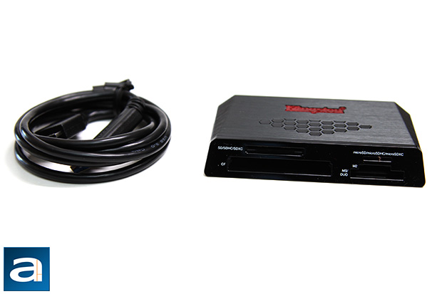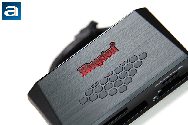 What is the best way to design a flash memory card reader? I don't know about you, but personally, I probably would not have been able to do a better job myself after seeing the Kingston FCR-HS3. Well, to be fair, I am in Electrical Engineering, so I do not engage in industrial design -- but that is beside the point. I just think Kingston's desktop card reader is a good looking device. Measuring in at 93.17mm wide, 52.68mm deep, and 16.00mm tall, the little black box is probably not going to be your best travel companion (Look out for my colleague Aaron Lai's MobileLite G3 review soon), but it fits right in on my desk. The FCR-HS3's mainly plastic construction feels solid in the hand, and comes with an excellent blend of a brushed aluminum finish on top, with a sleek glossy finish in front. Its lines are nicely angled to create a bit of visual excitement. A matrix pattern at the top seems to form a triangle pointing in the direction of the card slots, and the red Kingston logo actually lights up to indicate when a card is active. The red backlight will blink in the event of drive activity.