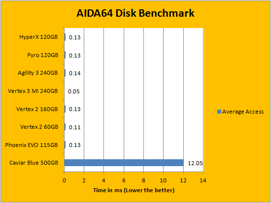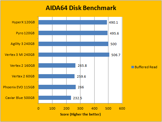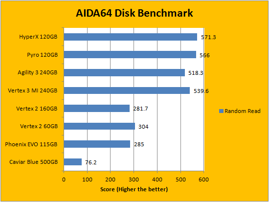 Rearranging the order for our presentation of solid state drive benchmarks in alphabetical order, results obtained from FinalWire's popular AIDA64 benchmarking and diagnostic program is the first set of graphs to make the list. As expected, the Kingston HyperX 120GB performed well within expectations; easily keeping up with the Patriot Pyro 120GB. As you can see in our graphs above, it hit exactly 500MB/s in the linear read test suite, just like all the other 25nm SandForce SF-2281 SSDs. Meanwhile, it took a lead even ahead of the OCZ Vertex 3 Max IOPS in the Random Read section, but traded spots with the Pyro in the Buffered Read category. This set closes off with a random access test, where the Kingston HyperX 120GB ended up right between the two OCZ SF-2281 based drives and consistent with the Patriot SSD.