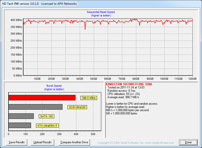After giving the Kingston HyperX 120GB a clean format and ensuring alignment and everything is correct, I fired it up for some testing in HD Tach. While HD Tach is more of a 'drag race' than a clear indication of real life performance, it is an excellent storage performance reference, and has been our favorite benchmark long before drives even cracked the 50MB/s mark. With an average read speed of 388.7MB/s according to HD Tach, if you look at the graph of Patriot's Pyro 120GB, we can see the Kingston HyperX is about 6MB/s ahead of its rival. Compared to SF-1222 SSDs, again we are looking at significant increases over the 230MB/s average mark. If 230MB/s is considered insanely fast, then what the heck is this?