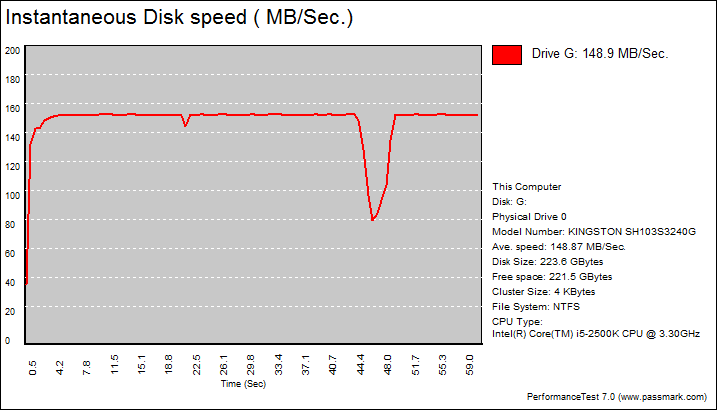 PassMark PerformanceTest 7.0's Advanced Disk Test, unlike HD Tune Pro 4.60, generates some awesome graphs right out of the box. It also provides valuable insight in simulating real world performance applications. To make things clear to you, the first graph simulates a database server, followed by a file server, web server, and workstation. For reference purposes, the renowned OCZ Vertex 3 Max IOPS 240GB posted numbers in the area of 153.9MB/s, 460.7MB/s, 409.3MB/s, and 89.0MB/s, respectively. Obviously, PassMark PerformanceTest 7.0 uses highly compressible data that SandForce based SSDs can really take advantage of, but the fact that the Kingston HyperX 3K 240GB can get so close, if not better, that the Vertex 3 Max IOPS is definitely an impressive feat.