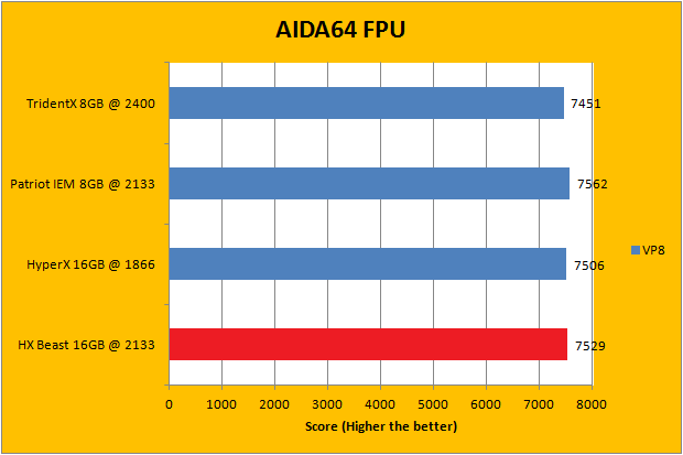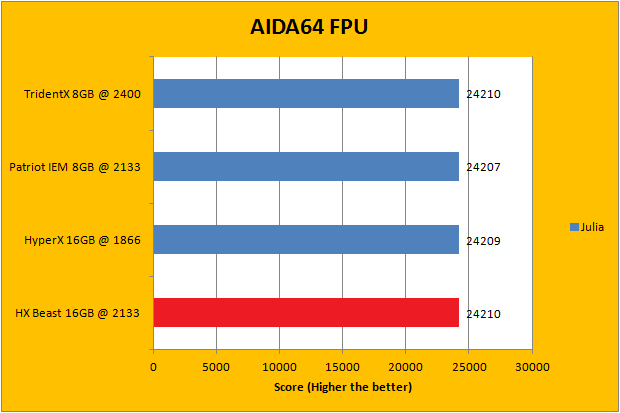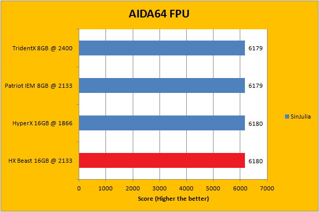 Usually, AIDA64's FPU benchmarks are the least exciting of all when writing a RAM review. This is because the way results are obtained is usually highly dependent on the tested processor; so much to an extent that the outcome is practically irrelevant to the speed or latencies of the installed memory modules. As you can see in our graphs above, all the results are within a fraction of a percent of each other. In the case of Kingston's HyperX Beast KHX21C11T3K2/16X 2x8GB dual channel kit, it tied for first place a couple of times, while keeping within a hair of the competition the rest of the time.