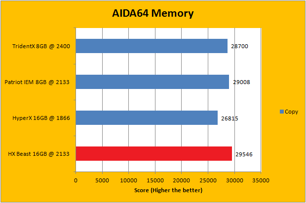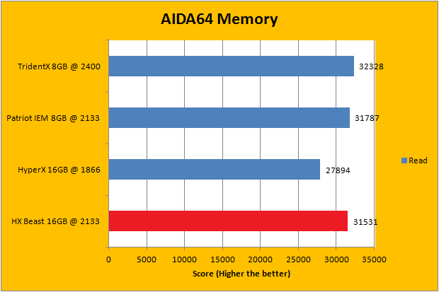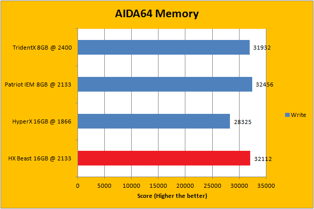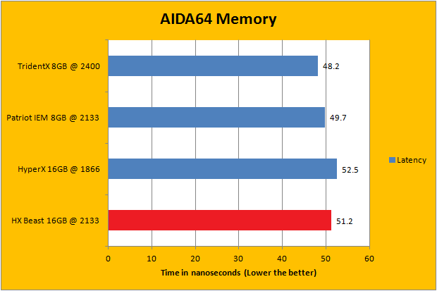 AIDA64's synthetic memory benchmark is the one next up to produce results for our review today. Although the fastest RAM usually scores the highest in these tests, this is not exactly what we are seeing here. Of course, the DDR3-2133 Kingston HyperX Beast, DDR3-2133 Patriot Intel Extreme Masters, and DDR3-2400 G.Skill TridentX took the lead over the DDR3-1866 Kingston HyperX Predator, but it is rather surprising how the trio of supra-2GHz kits actually traded spots consistently, despite the 266MHz frequency difference. G.Skill's TridentX, technically the fastest RAM in our tests today, only took the lead in the read result for bandwidth performance. The Patriot Intel Extreme Masters actually won by a hair in the write test, while the Kingston HyperX Beast took the crown for first place in the copy test. As far as memory latencies are concerned, the G.Skill TridentX was by far the lowest; the Kingston HyperX Beast is third place, just ahead of the HyperX Predator.