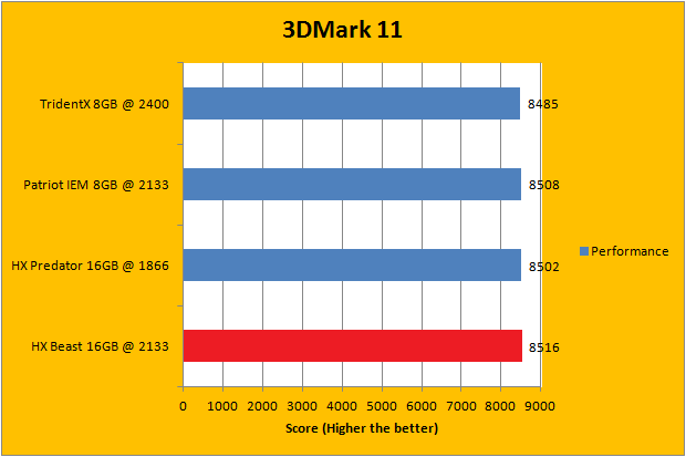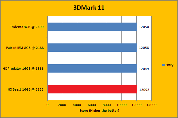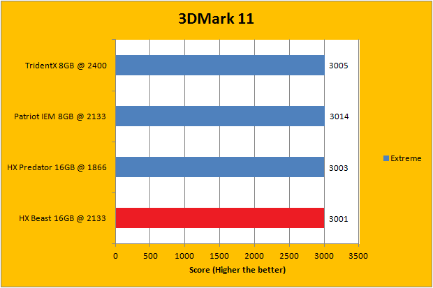 Like Futuremark's PCMark benchmarking suite, 3DMark 11 is yet another favorite among enthusiasts and reviewers alike. This iteration of 3DMark is available in three presets; separated into their respective categories of Entry, Performance, and Extreme. Entry is run at a resolution of 1024x600, Performance at 1280x720, and Extreme at 1920x1080. Futuremark's program is more than capable of driving current generation graphics cards to its knees. And it did. It takes advantage of DirectX 11 features such as tessellation, compute shaders, and multi-threading. With the Entry preset, the program is not very dependent on CPU and RAM, and becomes even less so as the resolution increases, as shown in our graphs above. Futuremark spent a lot of time reducing the variance of the benchmark results, and I think our numbers above reflects this reliably. The Kingston HyperX Beast KHX21C11T3K2/16X 2x8GB scored the highest in the Entry and Performance test, but surprisingly came in the lowest in the Extreme test. That said, they are all within decimals of a percent of each other, so it is nothing to get too caught up about.