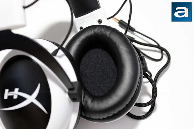 Continuing our journey up the headset, we are greeted by the leatherette padded earmuffs. Kingston has advertised these ears are actually padded with memory foam to garner even better comfort. The result is a great wearing experience, as it really is a great plushy feeling. In the picture I have the leather shown, but velour earcups are also included with the Kingston HyperX Cloud, so users do have a choice. I have tried both of these, and they both feel great on the ears. Swapping out the padding is easy, but not as straightforward as the Func HS-260. I did take a few minutes more just to stretch all sides to fit around the headset, but once it was in, it did not slip around at all. Another thing to note is the earcups are actually oval in shape. While the Func HS-260 expected us all to be like Mickey or Minnie Mouse with circular ears, the Kingston HyperX Cloud is shaped closer to a human ear, and it results in a good fit. Underneath these earcups are, of course, the actual drivers, which contains 53mm units, with a frequency response of 15Hz to 25000Hz. Rated impedance of the HyperX Cloud is 60 ohms.
