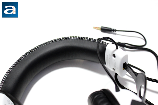 Two metal arms connect the ears to the headband, and these are quite a bit sturdier than it looks. While the metal may look thin, inferring flimsy quality, these arms stay in place, and do not offer any flex at all. They are also notched, so users can feel each increment as they pull out the earcups. The arms do not extend as far as I would like, though. While I know I have a big head, this could be trouble for users with heads even larger than mine. The Kingston HyperX Cloud was just able to fit my head, but of course, usage will vary based on your physical dimensions. At the top is the leather headband and, much like the earmuffs, it is quite plushy. The headband also employs the same memory foam inside, and has a stitched lining with white thread around the black leather. At the very top is the HyperX logo embroidered in black. This is both subtle and classy. The headband itself is still quite flexible, and can fit various shapes of heads. Once again, it is the small things that really make the HyperX Cloud into a great looking headset.