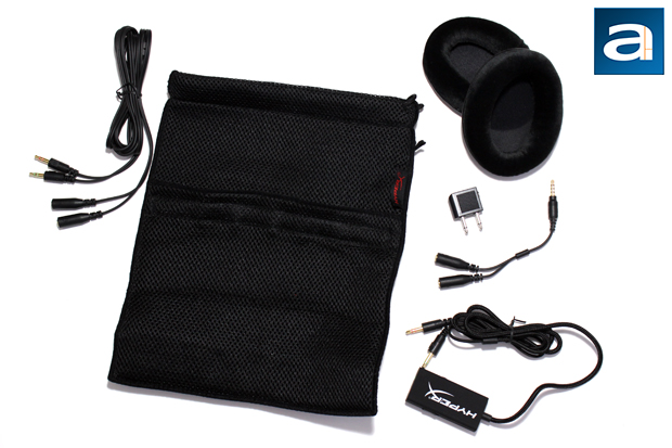 As I have stated before, Kingston really did throw in almost every accessory imaginable, so I will do a quick run through of what is included. The first thing is the two meter, unbraided extension cable. While I do not know why anyone would need 10 feet of moving when they are gaming, Kingston has made sure even these outliers are not left out. Next is the mesh bag, which is quite handy. It has a large opening at the top with a draw string and a front pouch with a Velcro seal. I was able to put everything in this mesh bag, even the extra earmuffs, without any trouble. Speaking of which, the velour earcups are located at the top-right corner of the photo, and once again feels really good on the ears. Underneath is the airplane adapter and mobile phone adapter, which are both self-explanatory.