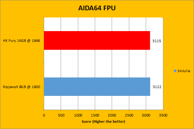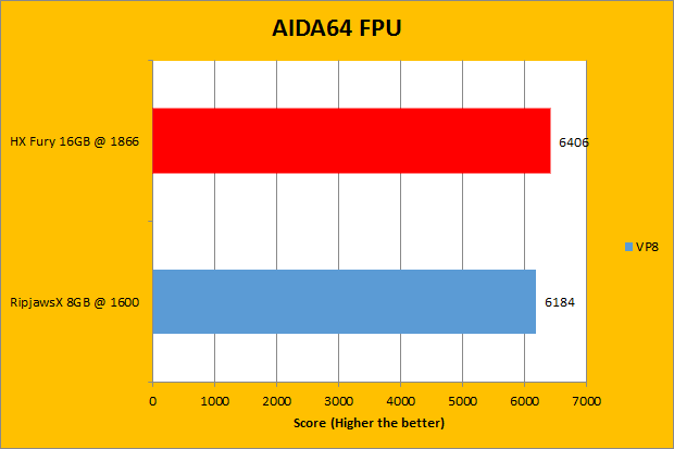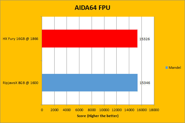 The next set of results are also from AIDA64, but rather the FPU benchmarks. However, as you have learned in the past, these scores are quite a bit more dependent on the tested processor. In fact, the outcomes are practically irrelevant to the speed or latencies of the installed memory modules. As you can see in the four graphs above, the scores are practically the same, once again with one exception. In this case, the VP8 case is the largest difference, with our review unit of the Kingston HyperX Fury taking the lead by more than two hundred points. However, the rest of the tests show our G.Skill Ripjaws-X with three other tests by the slightest of difference.
