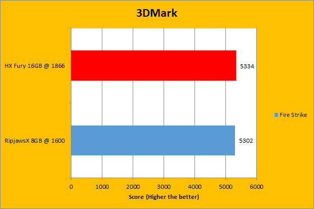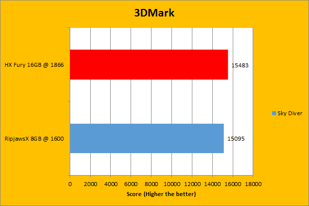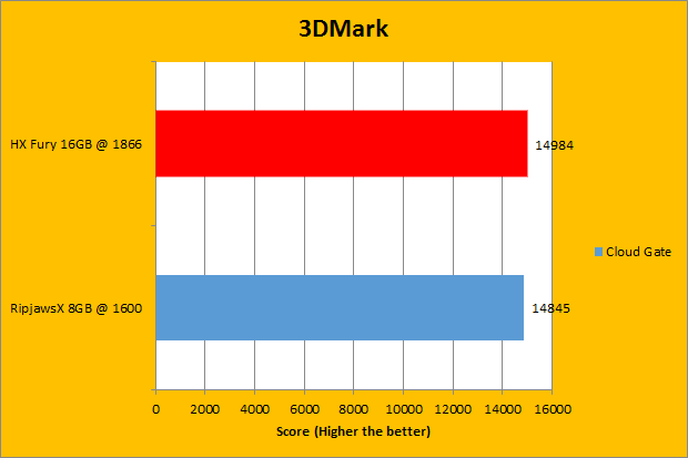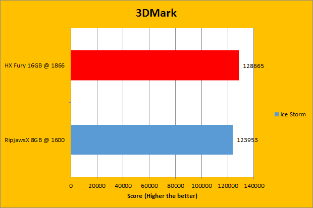 The latest version of 3DMark brings four tests in total, each of which are aimed at different computers. The first test, Ice Storm, is aimed at entry level PCs, as well as mobile devices. There are three different versions, including Vanilla, Extreme and Unlimited. The next test is called Cloud Gate, and is aimed at notebooks and home PCs. Afterwards is Sky Diver, which is for gaming laptops and mid-range PCs. Finally Fire Strike, which also comes in vanilla and extreme, aimed at higher end and overclocked PCs. I chose the vanilla version for all of these tests, thus Ice Storm runs at 1280x720 with DirectX 11 feature level 9, Cloud Gate runs at 1280x720 with DirectX 11 feature level 10. The two higher end tests, Sky Diver and Fire Strike, both run at 1920x1080 with DirectX 11 feature level 11. Looking at the results, they also are as expected, as the more graphically difficult tests produce a lower score than the lower-end tests. Comparing our two DDR3 RAM modules, the Kingston HyperX Fury came out on top for all of the results, but as each test got harder, the difference between the two units became slimmer. This tells me the higher end tests are less dependent on the RAM, but rather the GPU and processor.