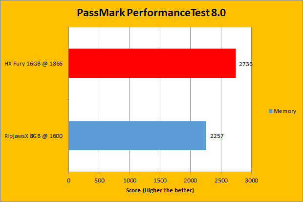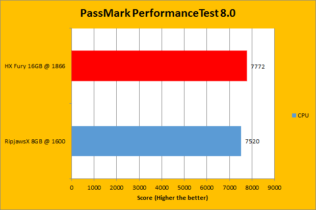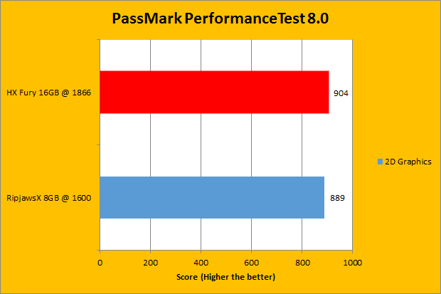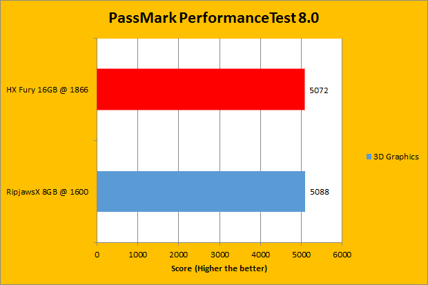 We have been using PassMark PerformanceTest in our battery of standard performance evaluation software here at APH Networks for quite a while now. PassMark Performance Test 8.0’s memory benchmarking tool is probably the only test in our setup that takes memory capacity into account. In a very general case, doubling the RAM will increase resulting scores by about 150%. Looking at our actual review units, the Kingston HyperX Fury kit is 16GB, while the G.Skill Ripjaws-X is only 8GB. The actual results, while they do not numerically reflect our past observations, show the difference between the two units, and is something we have expected. As for the rest of the graphs, the G.Skill memory unit only was victorious in the 3D Graphics, and only by sixteen points.