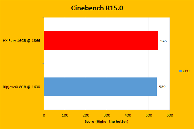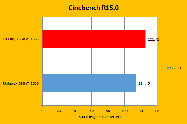 The latest iteration of the Cinebench R15 was released in September 2013, and has been always split into two different tests. One tests the CPU image rendering performance, while the other benchmarks the OpenGL video rendering performance. Of course, the main contributors to the scores produced is from the processor and the video card, but the RAM does still add to these results. As you can see in the results above, the graphs are both close, especially in the CPU tests. The OpenGL produces a larger difference of ten percent between the Ripjaws-X and the HyperX Fury.