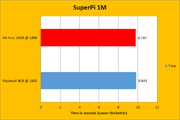 Running SuperPi has always been included as part of our benchmark suite as it provides a quick and easy way that is also quite interesting. As you can see in the graphs, the results are still quite close, with the difference being about forty-six thousandths of a second. The HyperX Fury though still comes out on top.