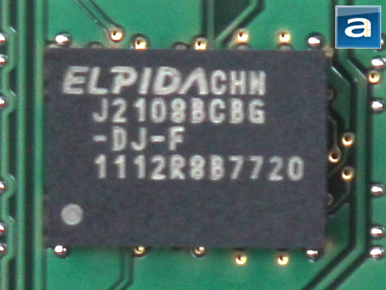 A closer look at the memory chips on the Kingston HyperX KHX1600C9D3X2K2/8GX 2x4GB dual channel memory kit. The photo above should be quite clear, excuse the shakiness -- it says "J2108BCBG-DJ-F" on each IC. These are Elpida manufactured chips, with eight 256MB chips on each side for a total of 4GB on each DIMM. As mentioned on the previous page, these RAM modules run at a frequency of DDR3-1600 with modest 9-9-9-27 latencies at 2T command rate. Since these RAM are designed for Core i5/i7 processors, they operate at a stock voltage of 1.65V.