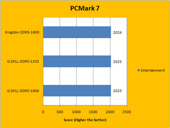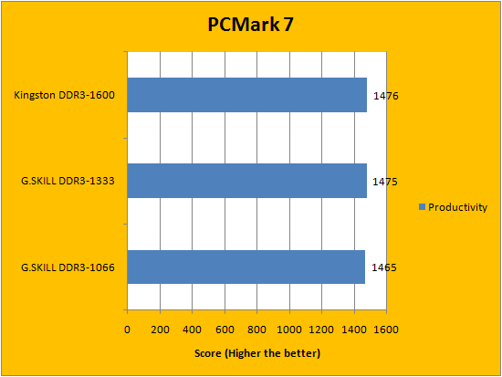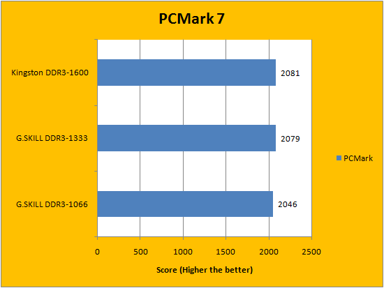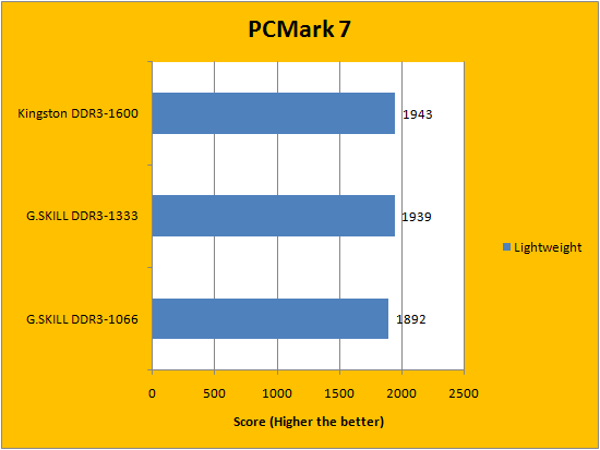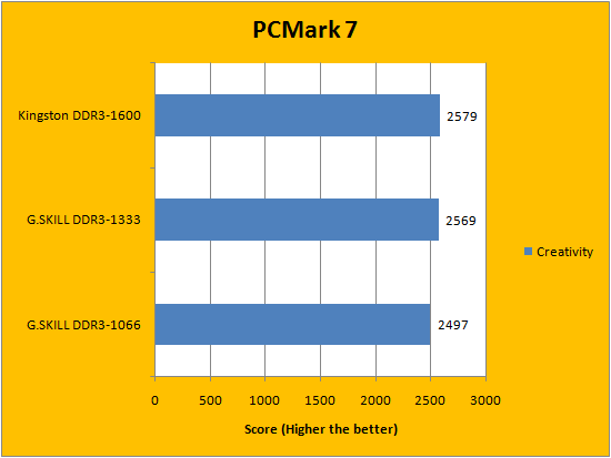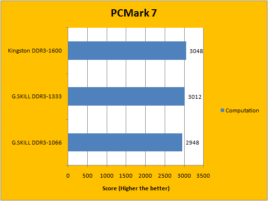 PCMark is a favorite benchmarking program for PC enthusiasts and reviewers alike, because it provides a very easy way to measure performance of different computers. It evaluates a system from seven perspectives (We only included the first six results, since the HDD test is not very relevant to a RAM review), and can be considered a synthetic real life benchmark. This is the third time we have included PCMark 7 in our reviews, following the Gigabyte G1.Sniper and G.SKILL F3-10666CL9D-8GBSQ 2x4GB articles. Futuremark claims they have brought down the variance of each run to ensure accuracy of their benchmarks, and with a relatively low margin of error in mind, all tested RAM came out to be extremely close.