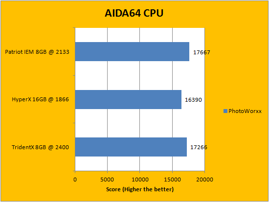 As always, our first set of benchmark results presented on the table are data obtained using AIDA64 CPU tests, formerly known as EVEREST. Version 2.70 (The latest release at press time; which can be downloaded from our Downloads page) results cannot be compared with those obtained using 2.60 and earlier, and since we are testing on a completely new platform anyway, might as well go with the latest. It is quite interesting how the products compare, because the slowest RAM has the highest capacity at 16GB, the middle set having the highest latencies, and the fastest kit is only 8GB, as with the guy in the middle. The results are really a toss-up between the three. The Kingston HyperX Predator took the lead in Queen and AES, while the G.Skill TridentX performed the best in Zlib. The Patriot Intel Extreme Masters claimed PhotoWorxx. Although the DDR3-2133 and DDR3-2400 kits were all tied up in Hash, the DDR3-1866 set was only one point behind.