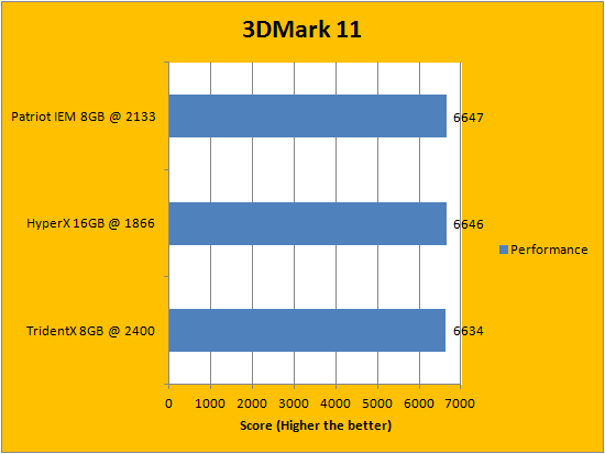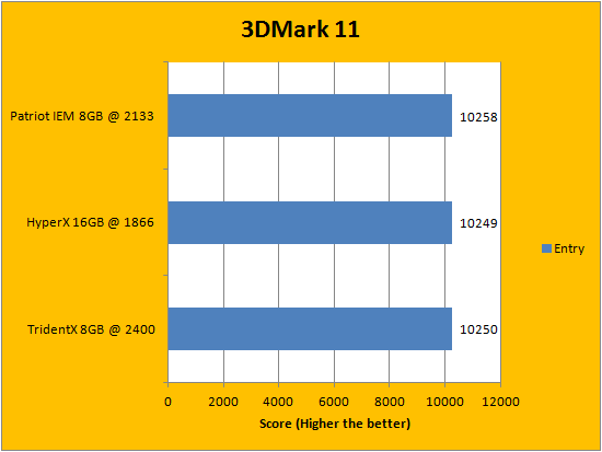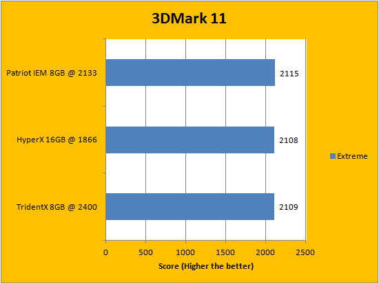 Like Futuremark's PCMark benchmarking suite, 3DMark 11 is yet another favorite among enthusiasts and reviewers alike. This iteration of 3DMark is available in three presets; separated into their respective categories of Entry, Performance, and Extreme. Entry is run at a resolution of 1024x600, Performance at 1280x720, and Extreme at 1920x1080. Futuremark's program is more than capable of driving current generation graphics cards to its knees. And it did. It takes advantage of DirectX 11 features such as tessellation, compute shaders, and multi-threading. With the Entry preset, the program is not very dependent on CPU and RAM, and becomes even less so as the resolution increases, as shown in our graphs above. Futuremark spent a lot of time reducing the variance of the benchmark results, and I think our numbers above reflects this reliably. The Patriot Intel Extreme Masters PC3-17000 2x4GB scored the highest in all three tests, while the Kingston HyperX Predator KHX18C9T2K2/16X 2x8GB and G.Skill TridentX F3-2400C10D-8GTX 2x4GB traded spots for second place.