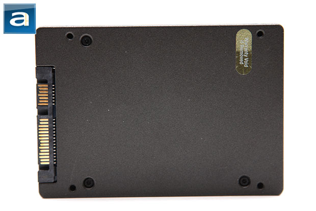 Turning the SSD around reveals a dark grey metal backplate. This is something users will come to expect from a solid state drive, as there are no exposed printed circuit boards like you would normally see with a traditional hard disk. The only thing that is common between the Kingston SSDNow V300 120GB SSD and a traditional hard disk drive is its SATA 6Gb/s and corresponding power connector at the end. As shown in our photo above, the back is completely blank, save for the warranty seal over one of the security screws. This is because all the miscellaneous information is found on the label on the top of the drive already, as discussed in the preceding paragraphs.