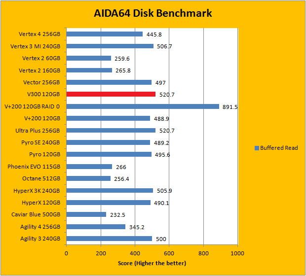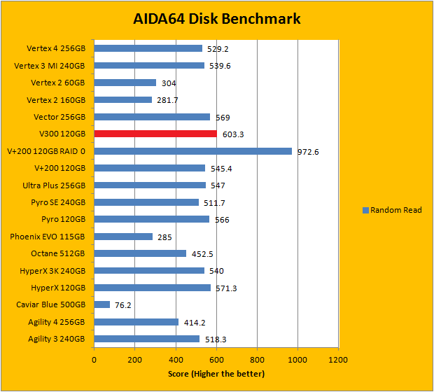Since our SSD review benchmark results are presented in alphabetical order, first up on the list are results from one of our favorite benchmarking programs, AIDA64 Extreme Engineer. Just to note, AIDA64 Extreme Engineer is a full synthetic benchmark. Unlike full synthetic motor oil, this usually does not carry a good connotation, but it does provide valuable insight into performance between different drives and different controllers. As you can see in our graphs above, the tried-and-true SandForce based Kingston SSDNow V300 120GB is definitely among the best. Delivering linear read results of about 527MB/s, random read of 603.3MB/s, and buffered read of 520.7MB/s, it is a nice improvement over the V+200 120GB. Its average access time of 0.10ms is a little better than industry average. Things are turning out quite well for the Kingston drive so far!