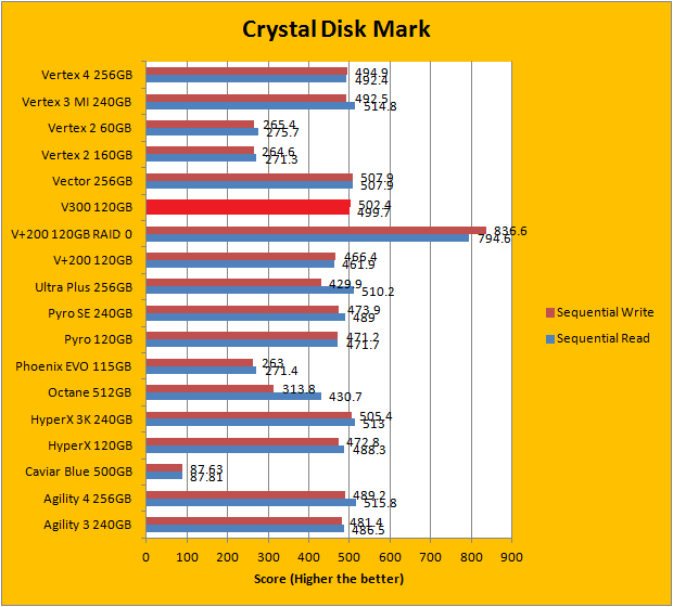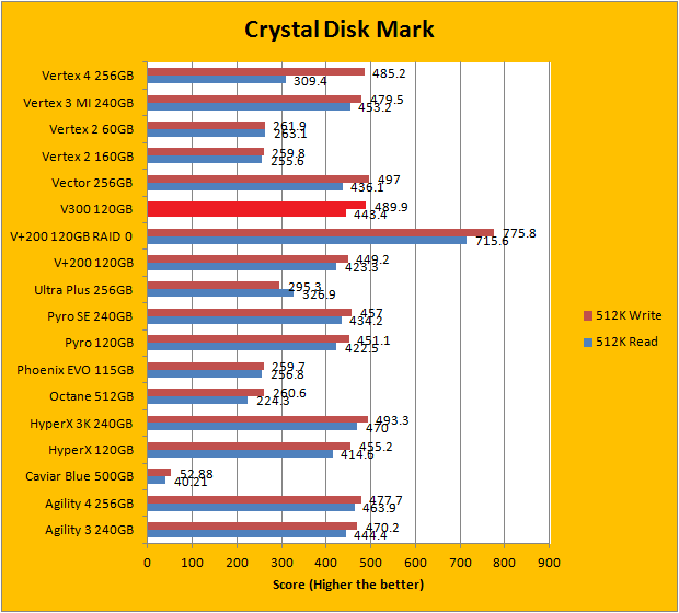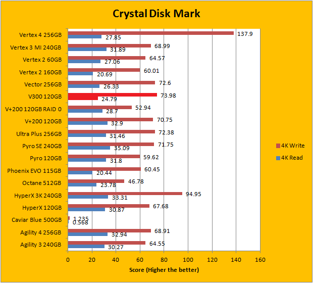 Crystal Disk Mark 3.0 is in the spotlight. Just a bit of background information; higher capacity drives tend to perform a little better in these tests. Although the Kingston SSDNow V300 120GB did not post earth shattering numbers in any of the results, it still remained very competitive against our large array of high performance solid state drives from various manufacturers. In this particular benchmark, the ability of a controller and flash memory to deliver high IOPS will provide huge benefits to the score. The SSDNow V300, in general, had a pretty strong performance margin over the company's own HyperX 120GB and V+200 120GB, as you can see in our graphs above.