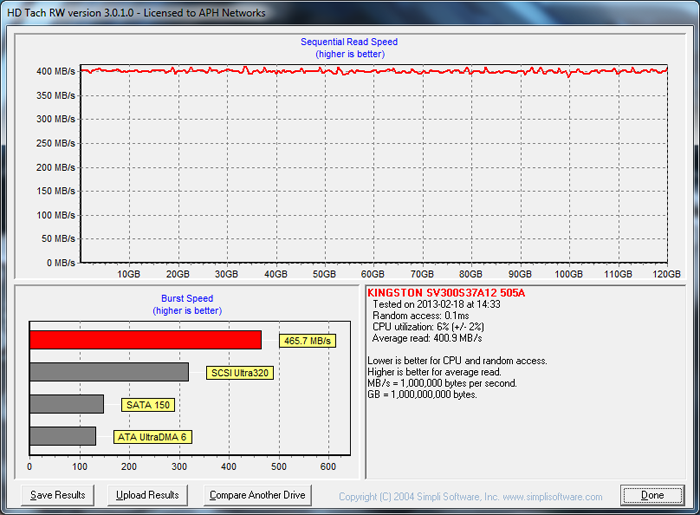 After giving the Kingston SSDNow V300 120GB a clean format and ensuring alignment and everything is correct, I fired it up for some testing in HD Tach. While HD Tach is more of a 'drag race' than a clear indication of real life performance, it is an excellent storage performance reference among SSDs with the same controller, and has been our favorite benchmark long before hard drives even cracked the 50MB/s mark. With an average read speed of 400.9MB/s according to HD Tach in single disk configuration, this is the second highest result we have ever obtained -- the highest being SanDisk's Ultra Plus 256GB we have reviewed last week. Normally, we expect a SATA 6Gb/s SSD to crack about 300MB/s -- but beating the 400MB/s mark is a whole different story. It is interesting to see that the fastest single SandForce drive in this test, the Patriot Pyro SE 240GB, delivered 'only' 388.8MB/s.