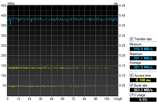 Unfortunately, HD Tune does not generate any fancy independent graph outputs in particular, so I had to edit my screenshot out a bit to make it look better for publishing in a review. Again, like our HD Tach results on the previous page, the line is nice and flat as before. It differs slightly in magnitude than the other program -- probably due to testing algorithms used -- but its performance characteristics are identical in practice. Other than that, the results are very commendable across the range; and the recorded access time is virtually nil. The Kingston SSDNow V300 posted impressive results; although below the 400MB/s mark this time. That said, do keep in mind the discussion we had on the previous page, as it still applies here.