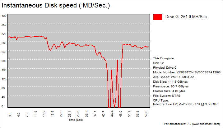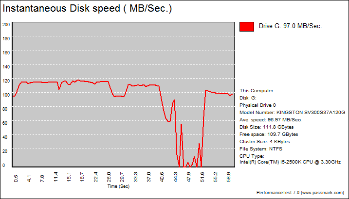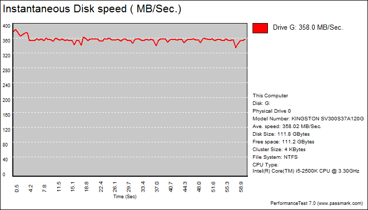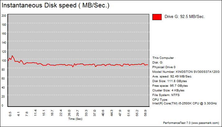PassMark PerformanceTest 7.0's Advanced Disk Test, unlike HD Tune Pro 4.60, generates some awesome graphs right out of the box. It also provides valuable insight in simulating real world performance applications. To make things clear to you, the first graph simulates a database server, followed by a file server, web server, and workstation. Obviously, PassMark PerformanceTest 7.0 uses highly compressible data in most tests that SandForce based SSDs can really take advantage of. However, it also requires high IOPS capabilities for the best score, and as such, the SSDNow V300 120GB is really no match against drives like the OCZ Vertex 3 Max IOPS 240GB and Kingston HyperX 3K 240GB. That said, it is pretty close, if not better, than the company's own SSDNow V+200 120GB. Click on the links to compare the results with the mentioned drives.