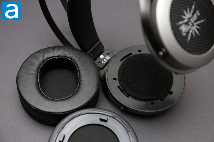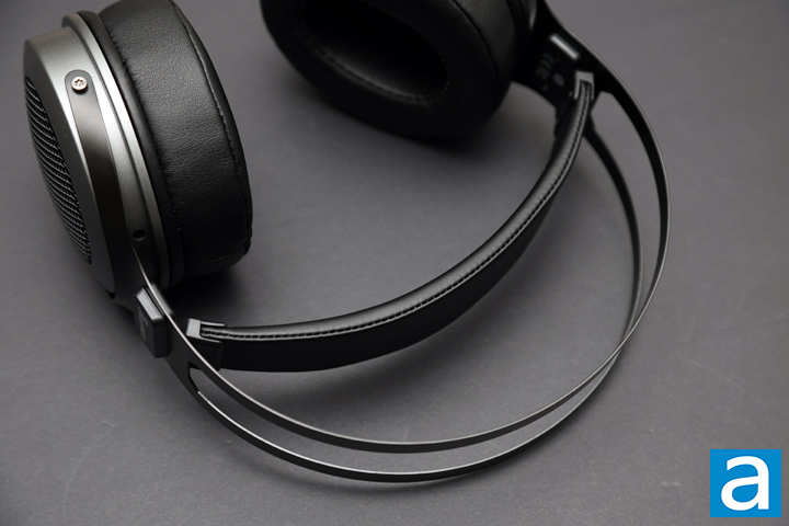 At the top of the Kiwi Ears Altruva, there is a suspended headband that contacts the wearer's head. It is wrapped in vegan leather for a softer feel. This headband does not need to be padded much either due to its suspended design. Each side is marked with L or R on the inside for easy orientation.