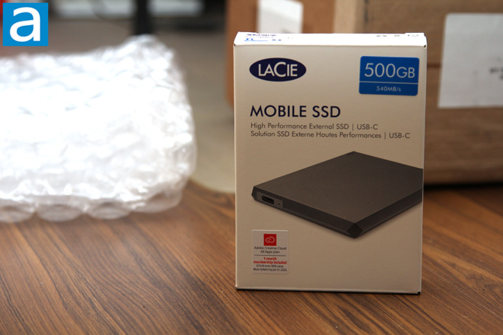 Although this is the first time I have ever reviewed anything from the LaCie brand, the Mobile SSD 500GB's retail packaging strikes a sense of familiarity for someone who has spent enough time at the local Staples. It is clean and down to business thanks to its white background and blue text. A photo of the SSD itself in three-quarters view is prominently displayed across the center, while the product name and description are printed right above it in sans-serif font. LaCie's logo is placed at the top left corner. A couple of stickers indicate its capacity, which, in our case, is the 500GB version, and Adobe Creative Cloud one-month free trial. Features and specifications are printed on the remaining sides of the box.