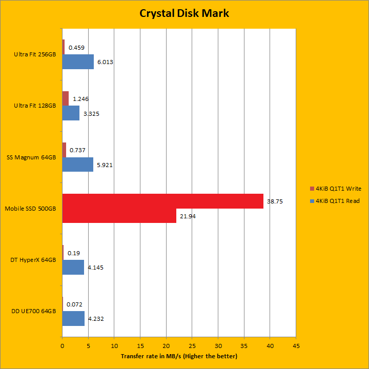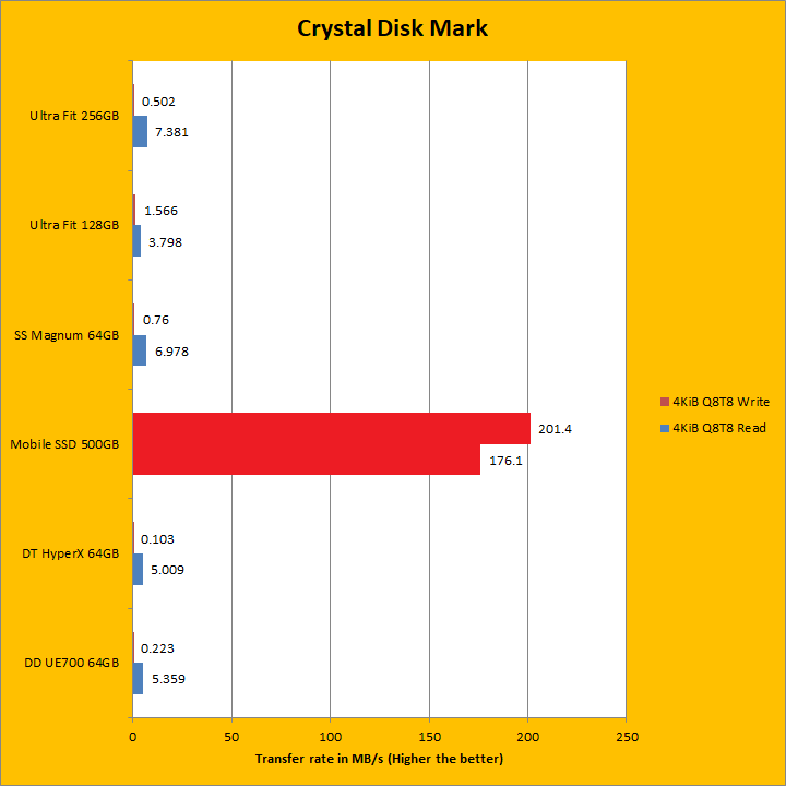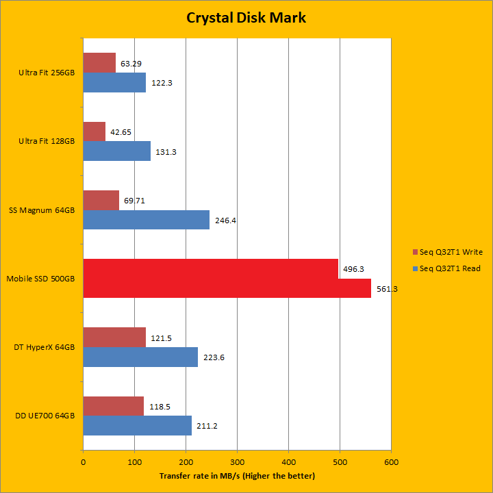 The LaCie Mobile SSD 500GB continued to dominate as we move into our Crystal Disk Mark sequential read and write results. Once again, it crushed the USB flash drives, but this is to be expected given they are different performance classes. Its sequential read and write results generally reflect what we have seen in the past two pages. At 561.3MB/s sequential read, this figure was very close to the advertised read speed. However, at 496.3MB/s sequential write, it fell a bit short this time around. As we move into the 4KiB Q8T8, 4KiB Q32T1, and Q1T1 territories, which require high input/out operations per second or IOPS, the LaCie Mobile SSD 500GB continued to blow all the other tested USB flash drives out of the water. Traditionally, this has always been a weak point for USB flash drives and a strong point for solid state drives as we can see here.