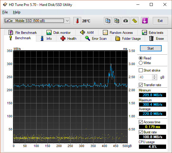 Unfortunately, HD Tune does not generate any fancy independent graph outputs in particular, so I just took a screenshot of the program. The LaCie Mobile SSD 500GB remained very flat on average. It differed slightly in magnitude than HD Tach -- probably due to testing algorithms used -- but its performance characteristics were identical in practice. Other than that, the results were top tier across the range; the recorded access time was very low as we would expect from an external solid state drive. The Mobile SSD 500GB posted an average of 220.0MB/s for its sequential read speed, which is nearly identical to the Patriot Supersonic Rage 2 256GB and Patriot Supersonic Magnum 2 256GB. The LaCie Mobile SSD 500GB's tested latency was slightly lower compared to what we have seen in AIDA64 and HD Tach at 0.179 ms. Do keep in mind the discussion we had on the previous page, as it still applies here.