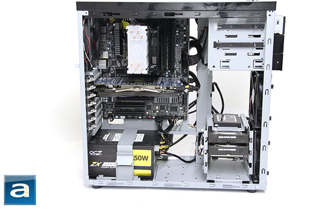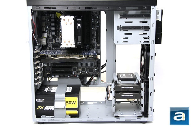 From the above photo, you can see why the cable management pillar in the LanCool PC-K9 is such a great addition. Even with the open motherboard design, I was able to create a somewhat organized system. The majority of the power and data cables were routed through this area, and it made the installation process to be much cleaner and more enjoyable. There were a few small issues with the plastic clips; being at times a little flimsy. The overall end result of the cable column, however, was nothing short of a brilliant feature, and one that other manufacturers should take notice. As I have mentioned before in this review, although having an open motherboard tray design is great for cable routing options, the end result usually means a somewhat messier-looking final product. Again, the provided cable routing options -- not just the pillar -- made this open motherboard design both convenient when routing cables, and bearable when dealing with cable tidiness. One issue I did encounter was plugging in the motherboard power cord. The top part of the motherboard tray features a small opening. However, this opening cannot fit any cables, because the top of the case covers this area. Therefore, I had to unscrew and remove the top of the PC-K9 in order to make use of this area.