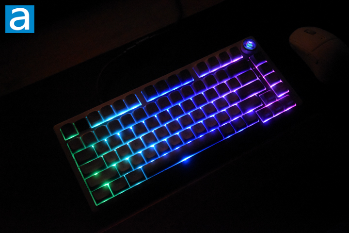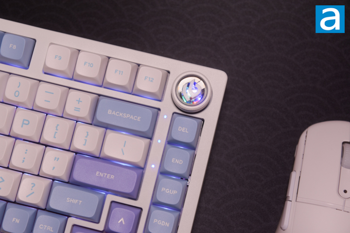 The Hi75 has many built-in functions and does not require software to be utilized. There are built in Android, Windows, and iOS modes that offer slightly different functions for the function row keys. These four modes can be accessed by pressing Fn + Q, W, E, or R for the respective modes. The main difference is that in Windows mode, the function keys will operate as normal, with special operations triggering in conjunction with pressing the Fn key. The other operating system modes invert the function keys to provide the special operations first, with the F-keys behind the Fn layer. The RGB LED backlight can also be toggled through the Fn layer. There are about a dozen effects to choose from, along with different speeds, brightness levels, and colors. The knob can be long pressed for two seconds to switch between two modes. There is a gaming mode which causes the LEDs in the knob to breathe, with a short press of the knob toggling backlight effects and rotation for brightness. In office mode, short pressing the knob will mute, and the knob rotation functions as volume control. The knob also has individual red, green, and blue LEDs lighting it up, but cannot be programmed. They, however, can be turned off if the user dislikes the look or implementation.