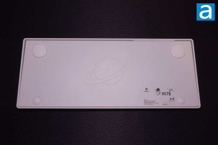 The edges of the keyboard are 90-degrees perpendicular to the top for a clean design with rounded corners. On the left rear of the keyboard, we find the USB Type-C port for a wired connection. The bottom of the keyboard is a tapered, angular piece of metal that provides the typing angle. Near the front are two small white circular rubber feet, while the rear has two large dome-shaped white rubber feet. Due to the dome shape, the keyboard has the potential to rock slightly when pressing the function row keys with significant force. The center of the bottom piece has a debossed image of a Saturn-like ringed planet molded into the aluminum. The bottom right corner has a clear label with some information about the keyboard as well as the serial number.