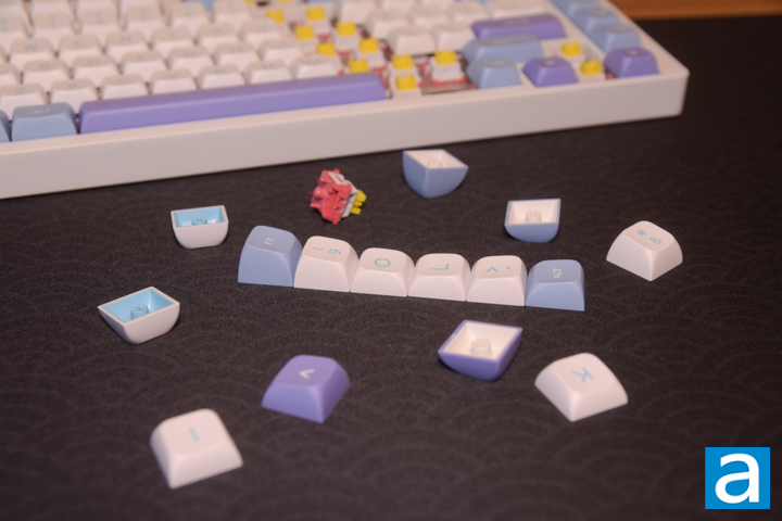 The keycaps featured on the LEOBOG Hi75 are sculpted in the MDA keycap profile. The MDA profile stands a bit taller than the Cherry profile, and has a larger, rounded keycap face. The MDA profile is very comfortable, and I had no issues typing with them. Due to the rounded corners, faces, and edges, the keycaps feel smoother and more comfortable when compared to the sharper edges of Cherry or OEM profiles. The keycaps are made using double shot plastic injection. This means the legends are molded in a different color plastic than the housing and prevents the legends from ever wearing off. The keycap material is not specified, but I presume from the feel of the keycaps that they are made from polybutylene terephthalate (PBT) plastic, which is durable and does not shine quickly. The alphanumeric keycaps are white with large, crisp, turquoise blue legends. The modifier keys are a mix of pastel purple and pastel blue with white legends. Overall, the keycaps look and feel of high quality, and have clear legends and vibrant colors.