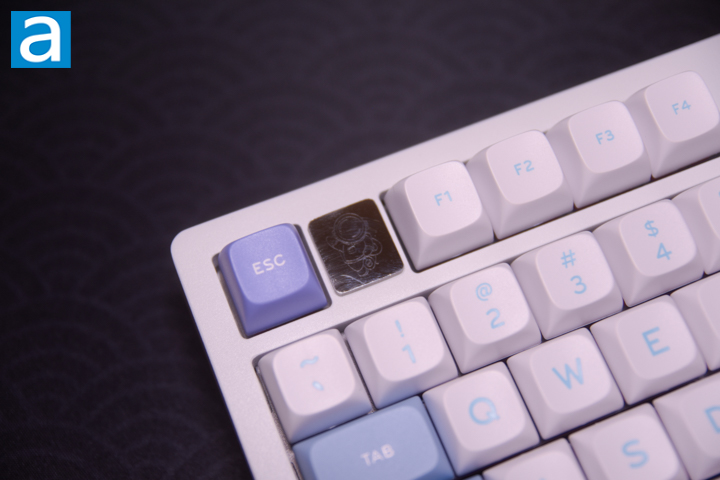 The LEOBOG Hi75 has a simple design and is painted in a white with a very slight tinge of gray. The top right of the Hi75 has a volume knob with the LEOBOG logo printed onto the clear center stem. Three indicator lights can be found below the knob and to the left of the navigation keys. They are backlit by a blue LED, indicating the status of Caps Lock, Num Lock, and Windows key Lock from top to bottom. I prefer the indicators to be white LEDs, so it clashes less with the RGB LED backlighting. The backlight is bright and vibrant, with the LEDs oriented south-facing. The keyboard has a decent heft to it, weighing in at 1.23kg. The housing appears to be made with cast aluminum as compared to a fully machined aluminum case to keep costs low. It feels sturdy and durable with excellent fit and finish. The dimensions of the keyboard are 330mm in width, 135mm in depth, and 45mm tall. The front edge is 21mm tall, and the rear edge is 36mm. I would recommend using a wrist rest for a more comfortable typing experience. At the top between the Esc and F1 keys, there is a small removable metal plaque with an engraved astronaut mascot. This small metal plaque is held on by a magnet in the top keyboard frame, and adds a cute touch to the keyboard design.