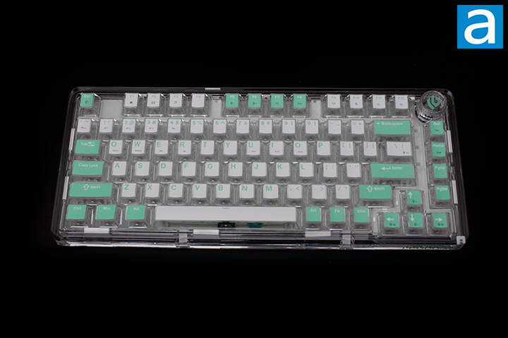 The LEOBOG K81 is an interesting and unique keyboard when it comes to appearance. It is important to note this keyboard comes in four different variations, with them being Pink Bunny, Mint Sea Salt, Star Travel, and Morse Code. Our particular model is the Mint Sea Salt color scheme. For any enthusiasts out there, the LEOBOG K81 is very reminiscent of the IDOBAO ID80 Crystal in terms of design, utilizing a clear case and an exploded 75% layout. LEOBOG opted to use a polycarbonate case with partial polycarbonate keycaps to maintain a consistent appearance throughout the keyboard. The K81 features a standard high-bezel design, keeping the keycaps almost level with the frame of the keyboard. While this does not expose the switches, they are still very noticeable given the clear design. LEOBOG chose to place their written logo on the front lip of the keyboard and actual logo on the knob. Something I appreciate is the fact that even when turning the knob, the logo remains right side up. The knob is very smooth to use, and I had no issues with the functionality at all. The K81 does not come with a wrist rest, but extra feet are included to create a more aggressive typing angle. I found no issue with typing on this keyboard after installing the additional feet, but your experience may vary.