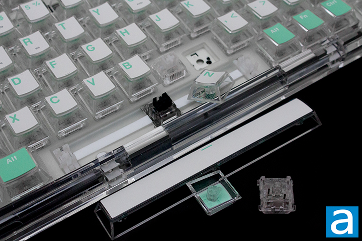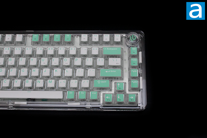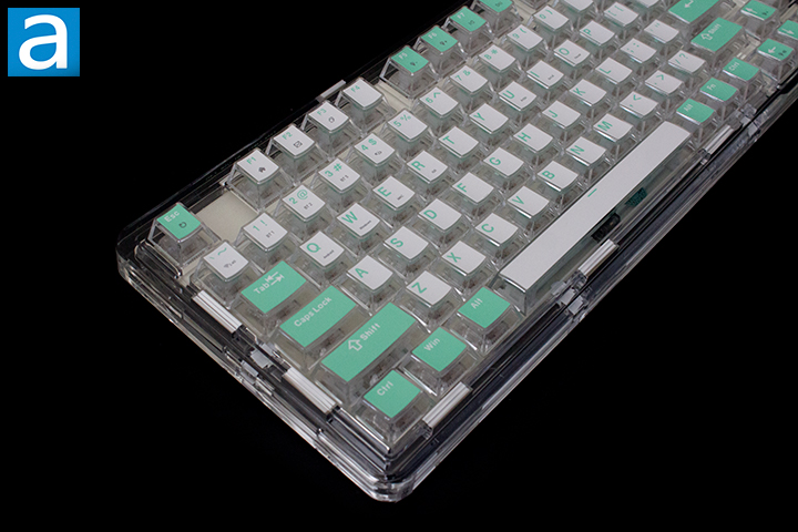 As for the keycaps, these are made primarily out of polycarbonate plastic, as previously mentioned. There is a top layer, which I believe to be ABS plastic due to its feel. I personally would have wanted PBT, or polybutylene terephthalate, for the tops, as the material is harder and resists shining better. The lettering is printed out on the ABS portion with a double shot process, which is created by molding two pieces of plastic together. This helps preserve the legending, as the color goes all the way through. The font used is quite standard and consistent with the rest of the board, which is something I personally prefer.