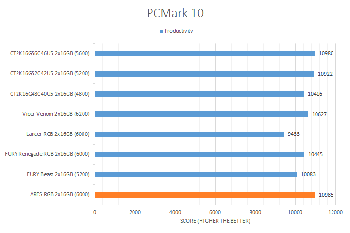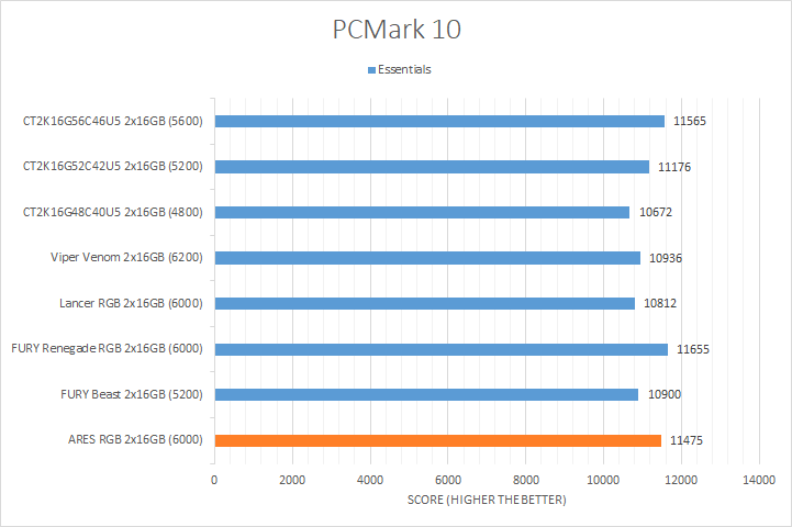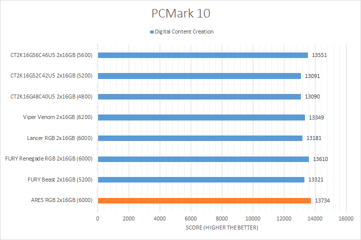 PCMark 10 is the popular full system benchmark from UL. A standard benchmark run provides scores in three categories, which includes Essentials, Productivity, and Digital Content Creation. Wrapping up all three categories is an overall score in the end. This is a test that aims to emulate real-world conditions, which provides interesting insight to the performance of your system. Based on our results, we can see that the Lexar ARES RGB DDR5-6000 kit was the best performer in this benchmark, finishing with the top overall score. If you breakdown the results, you can see this memory kit was the best in two of the three categories, while coming in third for the Essentials test. Overall, this was a good showing for the Lexar ARES RGB.