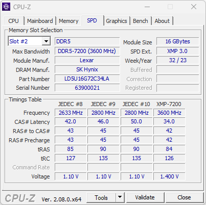 A screenshot of the memory tab in CPU-Z with Lexar's ARES RGB DDR5-7200 2x16GB installed. The SPD timings table in CPU-Z reads standard JEDEC specifications programmed into the memory as well as XMP data for running the memory at various speeds. The Lexar ARES RGB DDR5-7200 2x16GB retails for approximately $140 at press time.