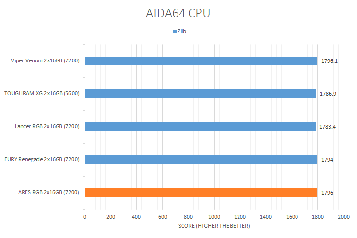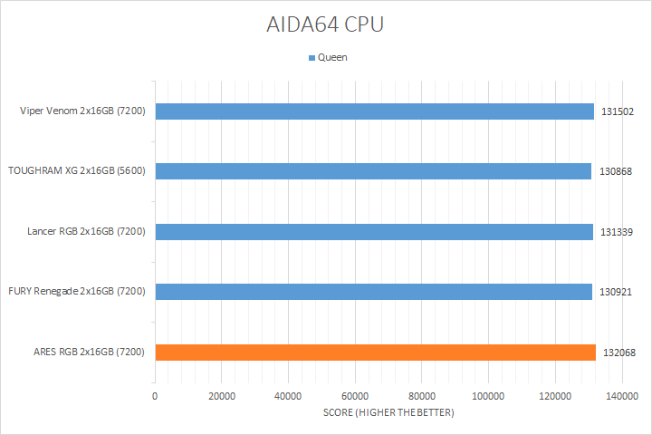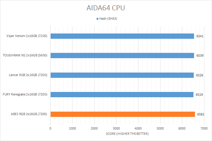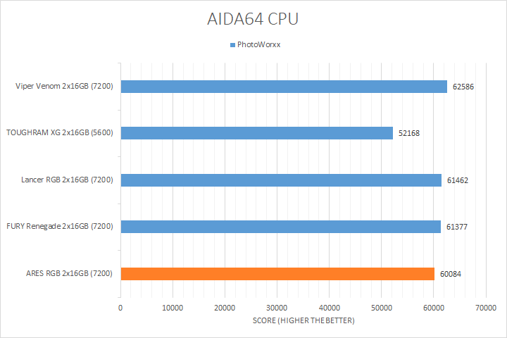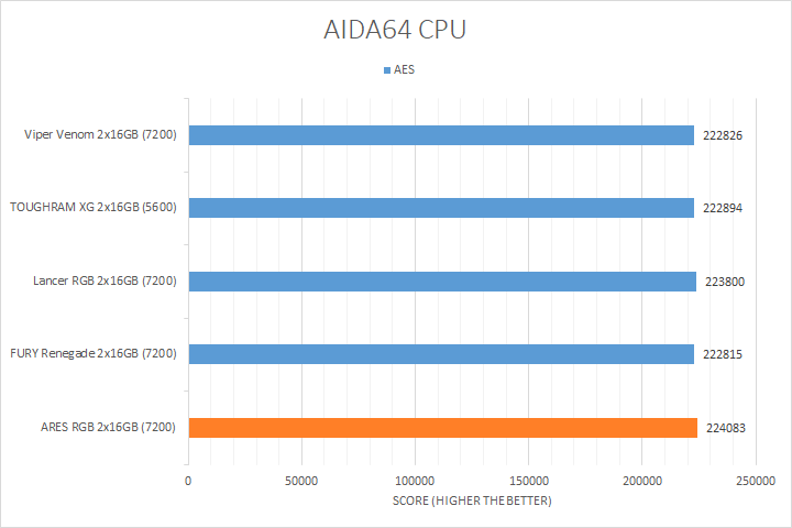 As always, our first set of benchmark results presented on the table are data obtained using AIDA64 CPU tests. Version 7.00.6700, the latest release at press time, can be downloaded from our Downloads page. It was quite interesting how the products compared, because there is more than a gigahertz between the fastest and slowest kit. As far as how their performance went, all of them were close to each other in most tests, with the Lexar ARES RGB DDR5-7200 2x16GB sitting at where we expected it to be in relative to the compared kits. AIDA64 did not gain much from stepping up your memory speed with the exception of the PhotoWorxx results, where the higher bandwidth ARES, Lancer, Viper Venom, and FURY Renegade kits occupied the upper end of the chart.