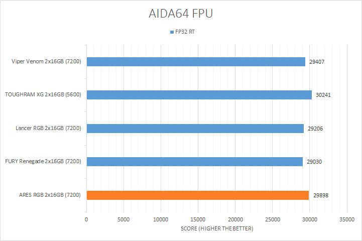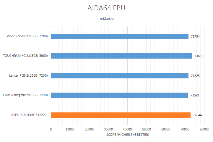 Usually, AIDA64's FPU benchmarks are the least exciting of all when writing a RAM review. This is because the way results are obtained is usually highly dependent on the tested processor, so much to an extent that the outcome is typically irrelevant to the speed or latencies of the installed memory modules. As you can see from our graphs above, all the results were within a few percent of each other. There were three results where the difference was more noticeable, which were the Mandel, FP32 RT, and FP64 RT tests. The highest bandwidth Lancer, FURY Renegade, and Viper Venom kits were measurably slower than the Thermaltake TOUGHRAM XG RGB D5 DDR5-5600 2x16GB, which was surprising. However, the ARES RGB DDR5-7200 scored higher than the other DDR5-7200 kits. At the end of the day, they were almost all reasonably within the same ballpark as each other.