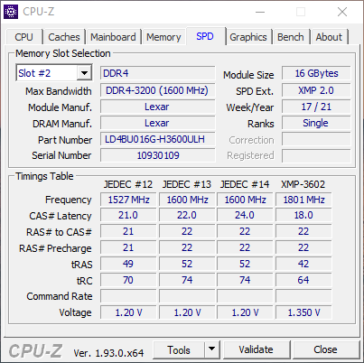 A screenshot of the memory tab in CPU-Z with the Lexar Hades RGB DDR4-3600 2x16GB installed. The SPD timings in CPU-Z reads standard JEDEC specifications programmed into the memory as well as Intel XMP data for running the memory at various speeds. Using the latest BIOS revision, my ASUS Prime X470-Pro had no issues detecting and working with the Hades RGB out of the box. It should be noted, you may need to enter your BIOS to ensure the correct XMP or DOCP profile is active. At launch, the Lexar Hades RGB DDR4-3600 2x16GB has an MSRP of $160 USD.